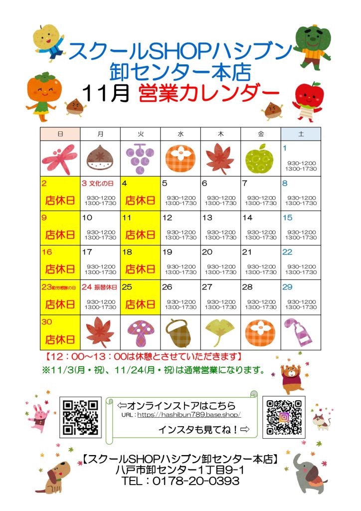 2025年11月営業カレンダー(スクールSHOPハシブン卸センター本店)