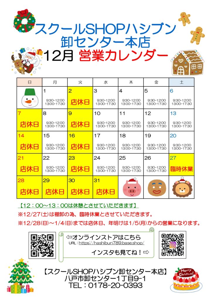 2025年12月営業カレンダー(スクールSHOPハシブンハシブン卸センター本店)