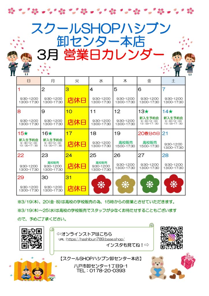 2026年3月営業カレンダー(スクールSHOPハシブン卸センター本店)